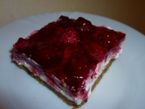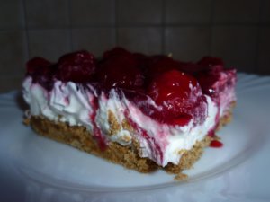 Imádom a krémes-gyümölcsös sütiket, főleg, ha sütni sem kell hozzá. Ahogy az előző receptnél írtam, jön a tavasz, és vele együtt a gyümölcsszezon is. Az egyik üzletben már régóta kacsintgatott rám a fagyasztott málna, most jött el az ideje, hogy megvegyem. 🙂 Nem bántam meg, mert nagyon finom édes, ráadásul jó nagy szemű, így még gusztább tőle a süti. Szóval, a süti ötlete nem az enyém, egy amerikai oldalon találtam, ahol az USA néhány tagállamának legnépszerűbb desszertjeit írták le. Természetesen azonnal megtetszett, bár az eredeti receptben meggy szerepel, ezt cseréltem málnára, illetve a kekszből kihagytam a cukrot. És ezek a színek! Imádom őket. Nem túlzás, ha azt mondom, egy délután alatt elfogyott az egész tepsivel, pedig dupla adagot készítettem. Annyira krémes, kellemesen édes, és persze gyümölcsös, hogy egyszerűen nem lehet abbahagyni. 🙂