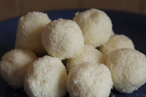 A hozzávalókat gyúrjuk össze, tegyük hűtőbe fél-egy órára, majd formázzunk belőle diónyi méretű golyókat, végül egyenként hempergessük meg őket kókuszreszelékben.
