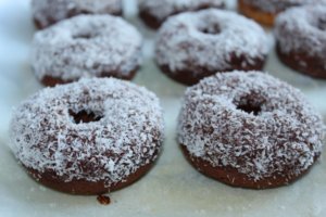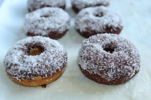 Születésnapi meglepetés fánkok. 🙂 Legkedvesebb barátom születésnapjára sütöttem ezeket a fánkokat. Imádja a kókuszt, és fánkot már nagyon régen sütöttem. Mivel nyári meleg van, a csokoládéval csínján kell bánni, mert könnyen megolvad, az ember csupa maszatos lesz tőle. 🙂 A fánkról annyit, hogy nem tipikus sütőben sült tésztája van, mert abba író kell, ez pedig nem volt itthon. Így egy nagyon könnyű kevert tészta lett a végeredmény. A recept eredetije egyébként a szintén a blogon található Vörös áfonyás-narancsos fánk csak néhány hozzávalót elhagytam, illetve néhány hozzávalót helyettesítettem mással, lévén, kókuszos fánkról van szó. 🙂