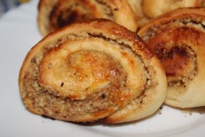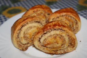 Először 1 dl tejet langyosítsunk meg, tegyük bele a kétféle cukrot, morzsoljuk bele az élesztőt, és hagyjuk felfutni. Közben a maradék tejben olvasszuk fel a margarint. Az átszitált lisztet keverjük össze a sóval, adjuk hozzá a tojásfehérjét, a felfutott élesztőt, végül pedig az olvasztott vajas tejet. Gyúrjunk belőle sima tésztát, akkor jó, amikor már elválik a tál falától. Tegyük egy (kelesztő) tálba, és kb. 30 percre tegyük félre. Amíg kel a tészta, a töltelékhez valókat keverjük össze, tegyük félre. Miután a tészta megkelt, nyújtsuk kb. fél centiméter vastagra, kenjük meg a cukros margarinnal és szórjuk meg a darált dióval. Tekerjük fel, vágjunk belőle háromszögeket, majd sorakoztassuk őket egymástól kb. 2-3 centiméter távolságra egy sütőpapírral kibélelt tepsibe. Hagyjuk még őket pihenni, amíg felmelegszik a sütő 180 fokra. Kenjük meg mindegyiket az olajos tojássárgájával, majd tegyük a sütőbe, és süssük őket aranybarna színűre.