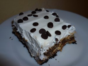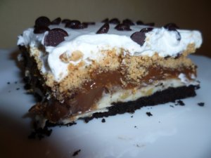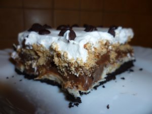 Az Oreo-ból szedjük ki a krémet, majd a kekszeket daráljuk le. Keverjük össze a margarinnal, és egyengessük egy alufóliával kibélelt, kisebb tepsibe. A mascarpone-t keverjük össze a pépesített banánnal és a kétféle cukorral. A pudingot a tasakon leírtak szerint főzzük meg a tejjel. A mascarpone-s krémet kenjük a kekszrétegre, majd szórjuk meg egy kevés teljes kiőrlésű darált keksszel (elhagyható). Ezután jön a puding, megint darált keksz, majd a végén a felvert tejszínhab. A tetejét szórjuk meg a csokoládé cseppekkel, takarjuk le, majd tegyük a hűtőbe néhány órára, vagy egész éjszakára.